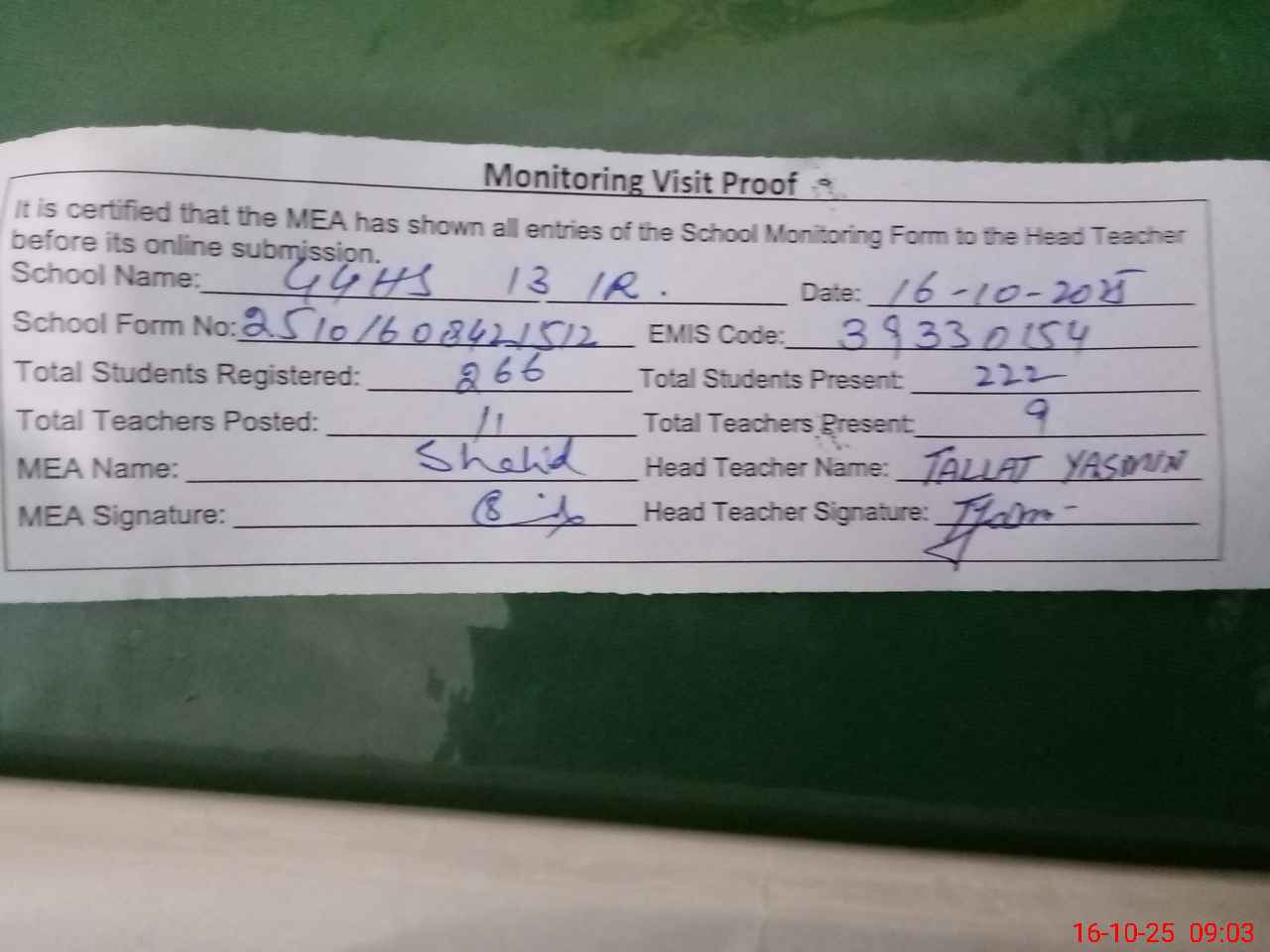 | Attendance Register | Head Teacher | MEA with School | Visit Proof |