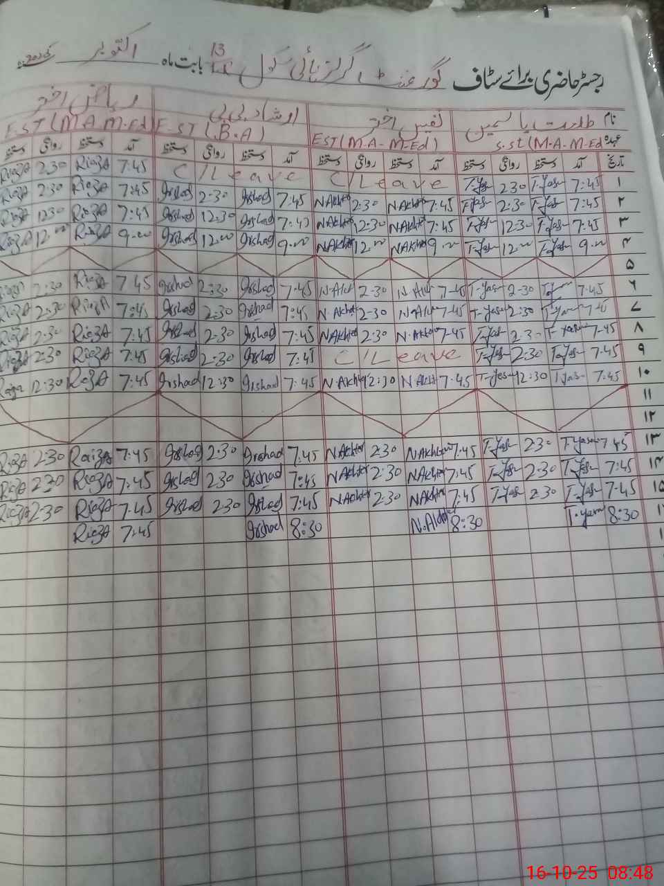 | CNIC | Full Name | Designation | R/C | Absence During Last Calender Month |
