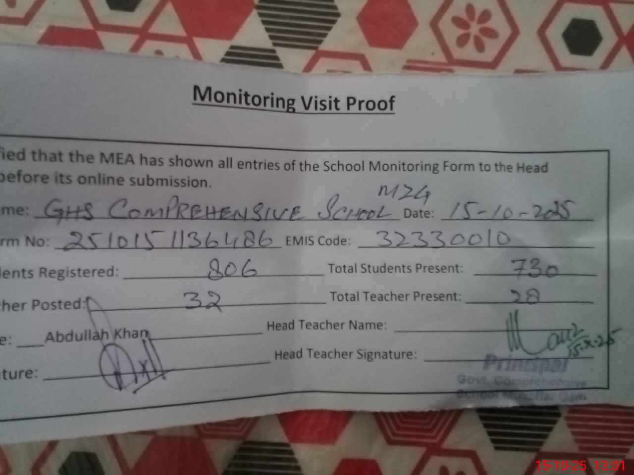 | Attendance Register | Head Teacher | MEA with School | Visit Proof |