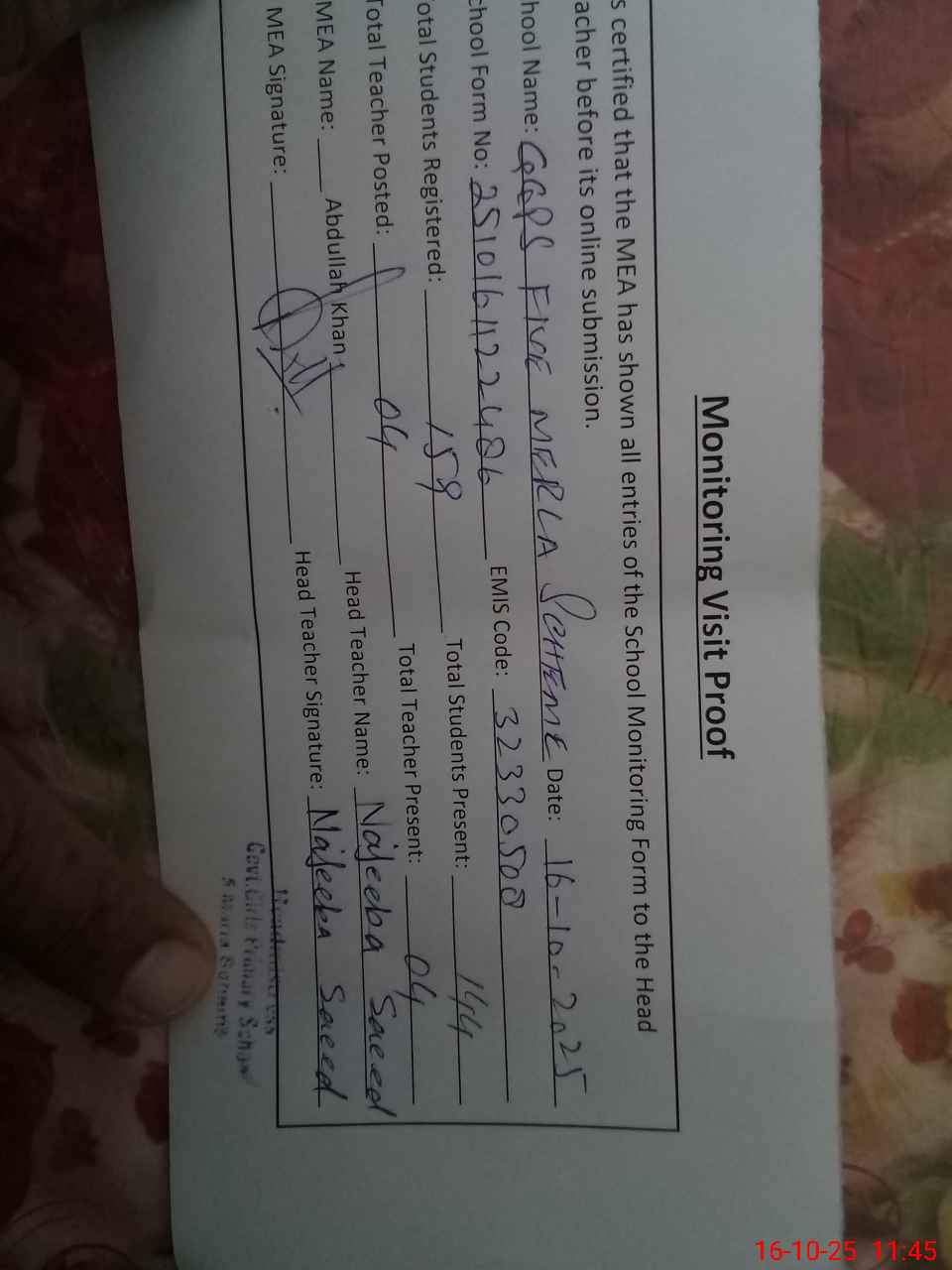| EMIS Code: 32330508 | Name of School: GGPS FIVE MARLA SCHEME | |||