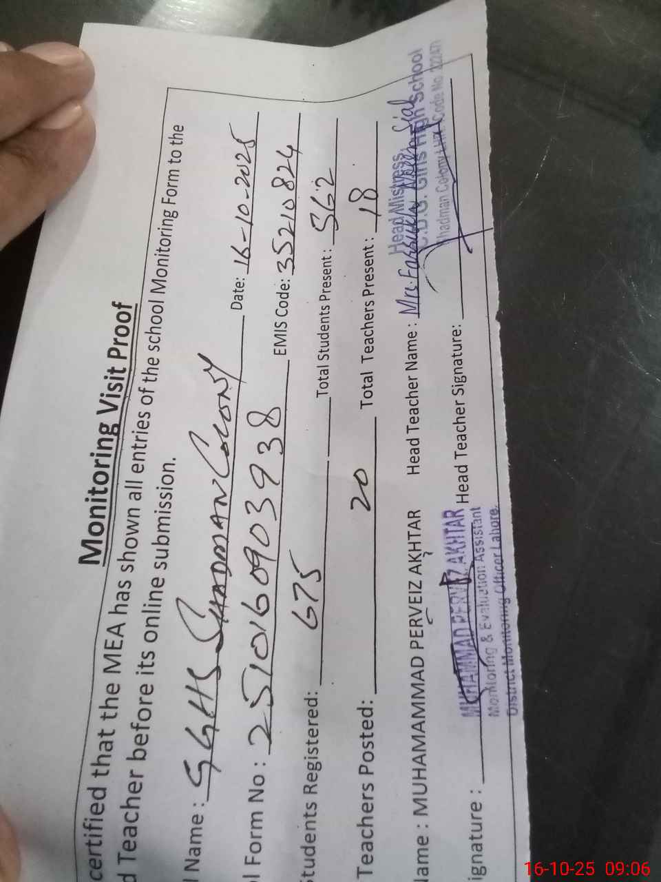 | EMIS Code: 35210824 | Name of School: GGHS SHADMAN COLONY (EX-MCL) | |||