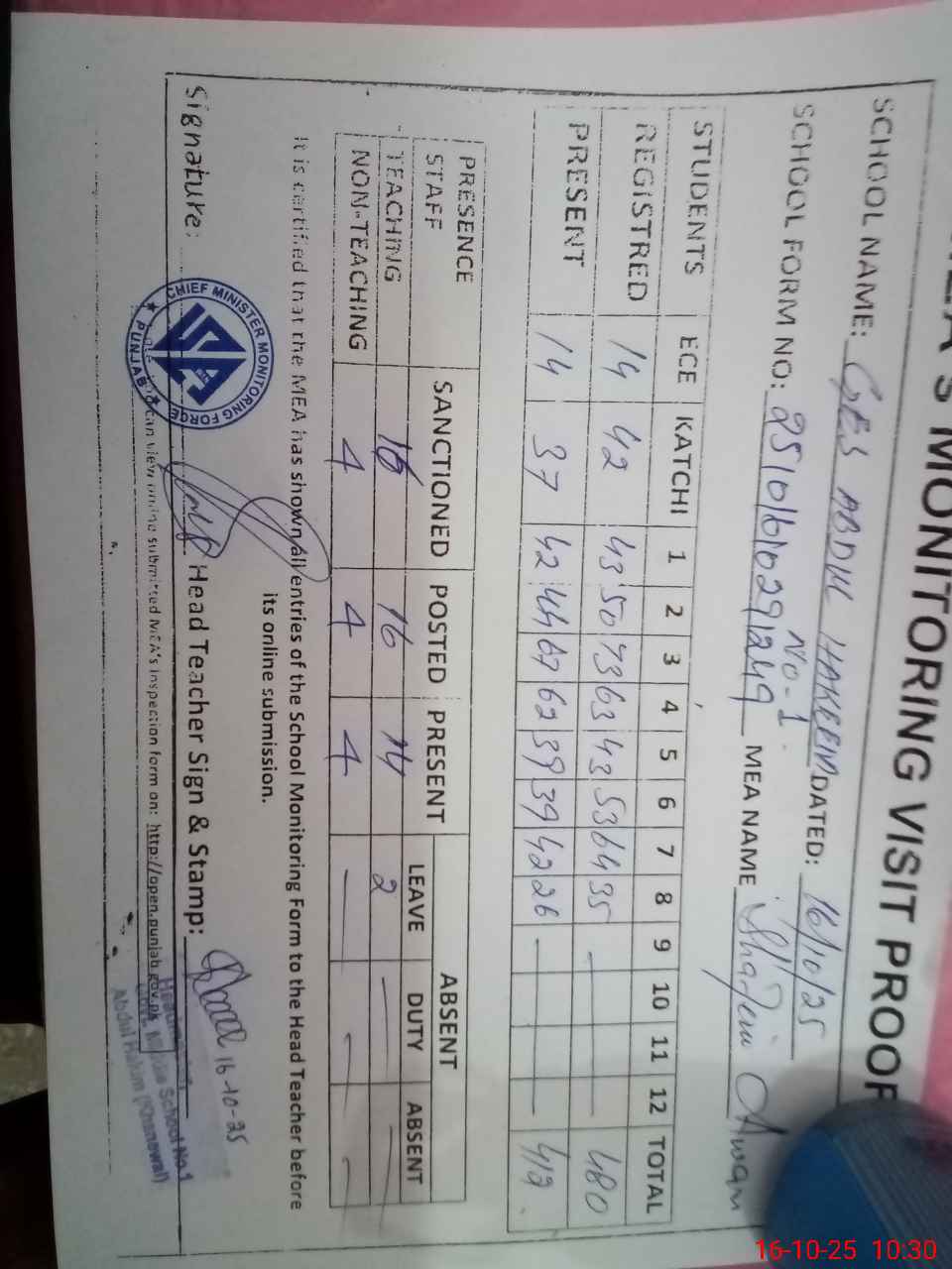| Certified that this School was Inspected by the Undersigned MEA/DMO Today and the Information Stated Above is as Per Record. | |||||