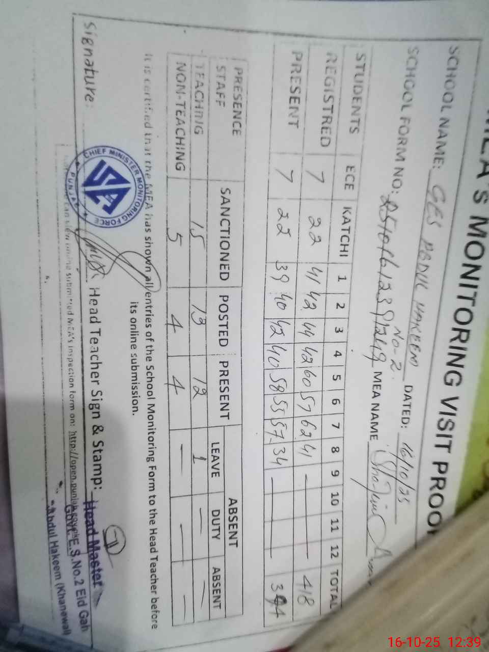 | Certified that this School was Inspected by the Undersigned MEA/DMO Today and the Information Stated Above is as Per Record. | |||||