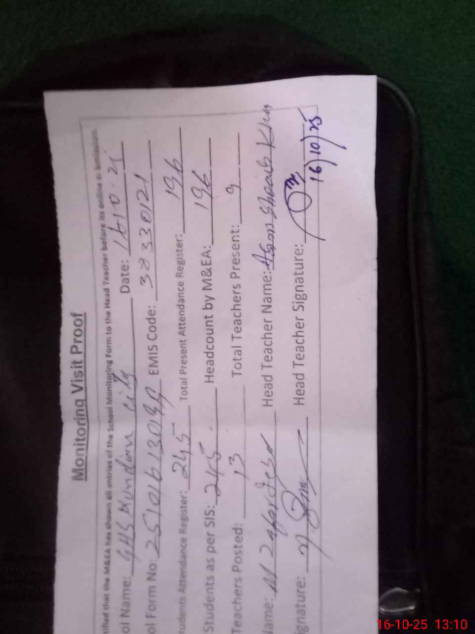 | Attendance Register | Head Teacher | MEA with School | Visit Proof |