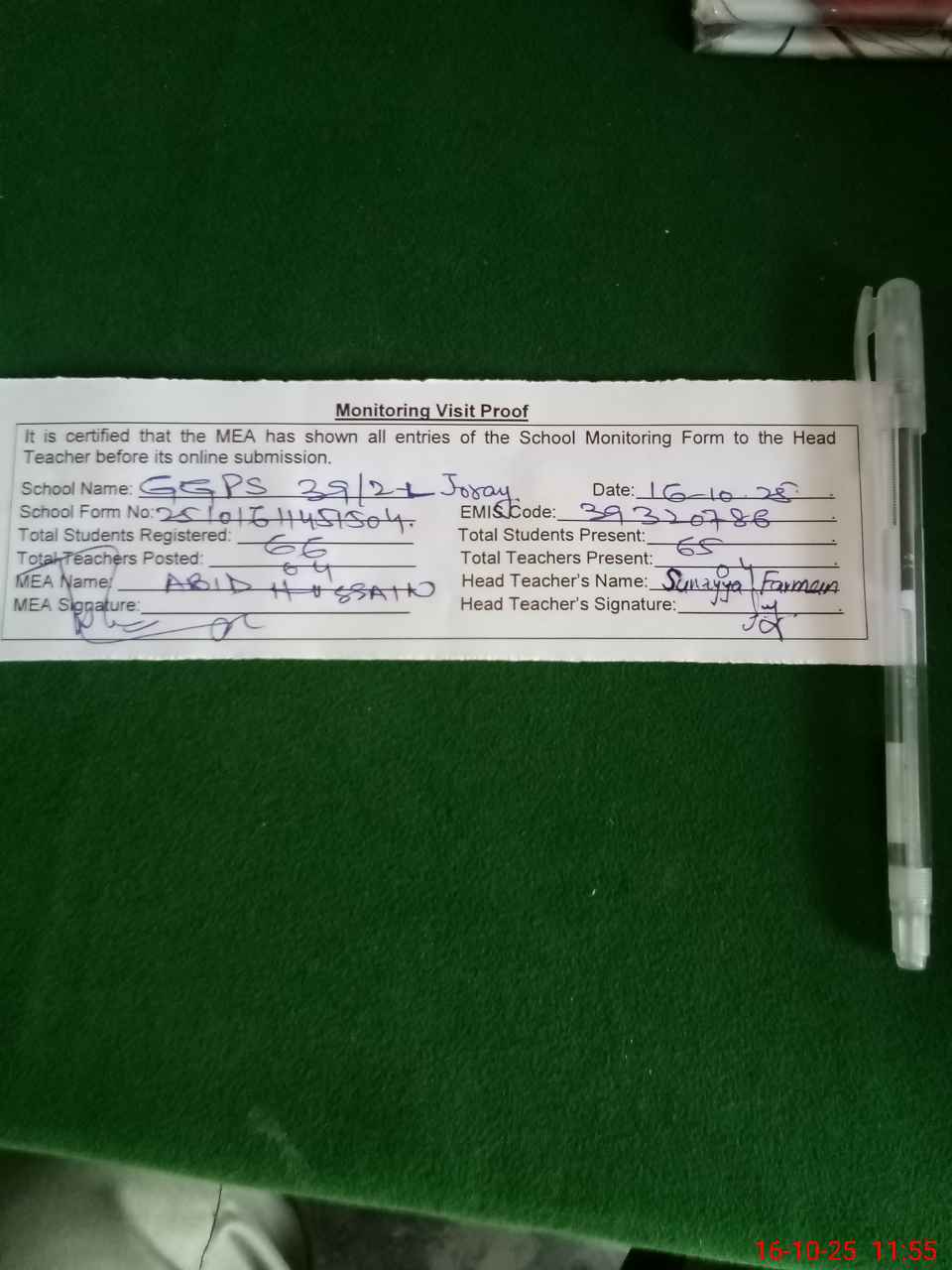 | Certified that this School was Inspected by the Undersigned MEA/DMO Today and the Information Stated Above is as Per Record. | |||||