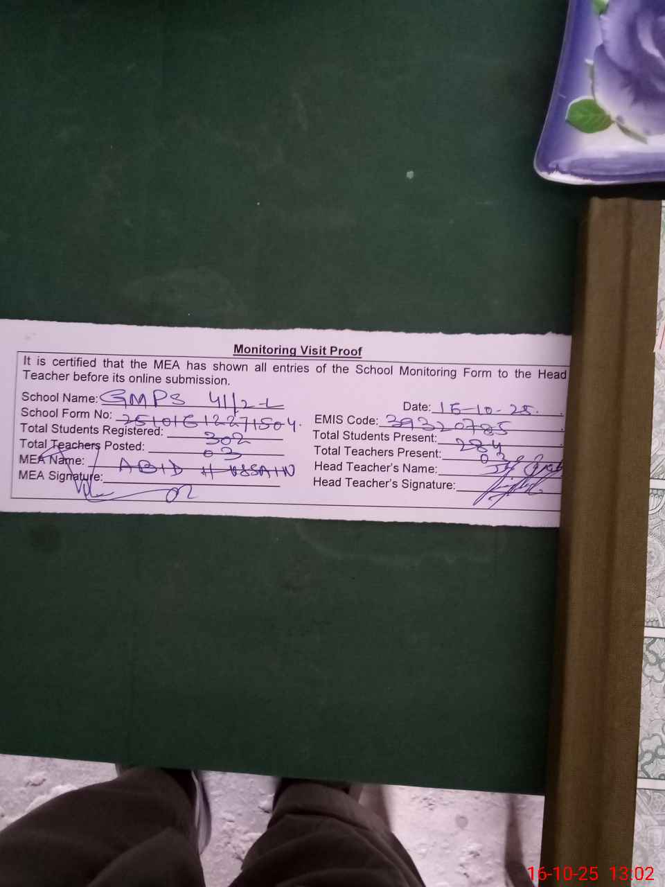 | Certified that this School was Inspected by the Undersigned MEA/DMO Today and the Information Stated Above is as Per Record. | |||||