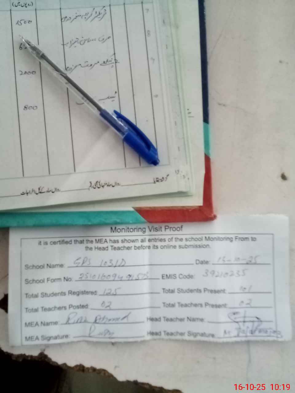 | Attendance Register | Head Teacher | MEA with School | Visit Proof |