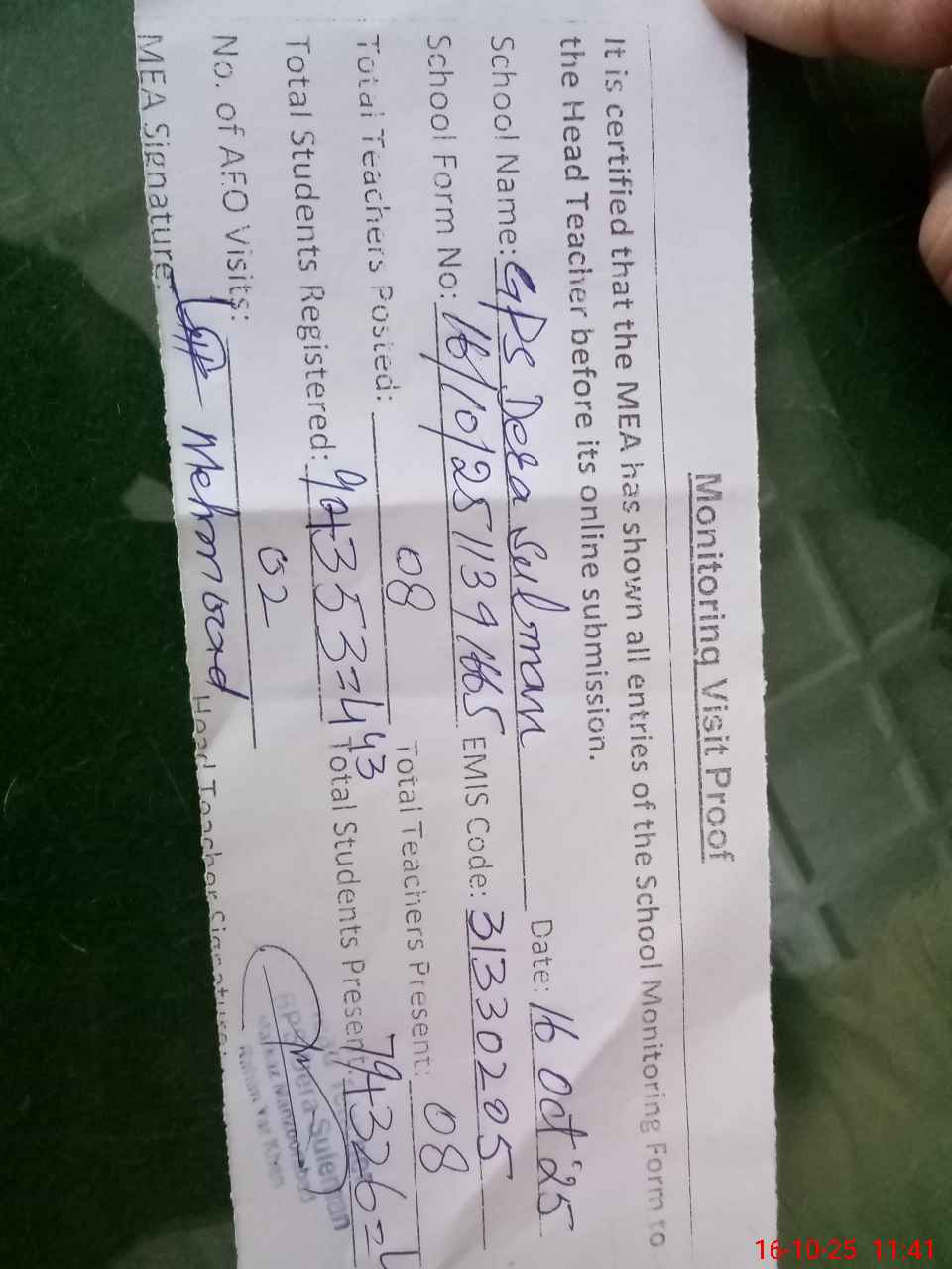 | Attendance Register | Head Teacher | MEA with School | Visit Proof |