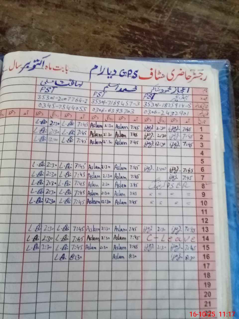 | CNIC | Full Name | Designation | R/C | Absence during last cal. month |
