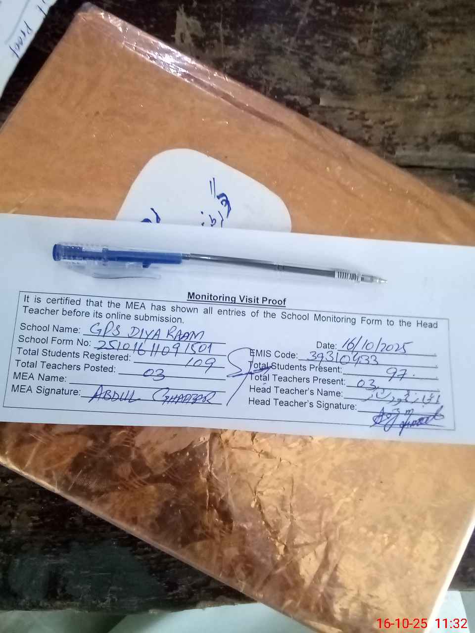 | Attendance Register | Head Teacher | MEA with School | Visit Proof |