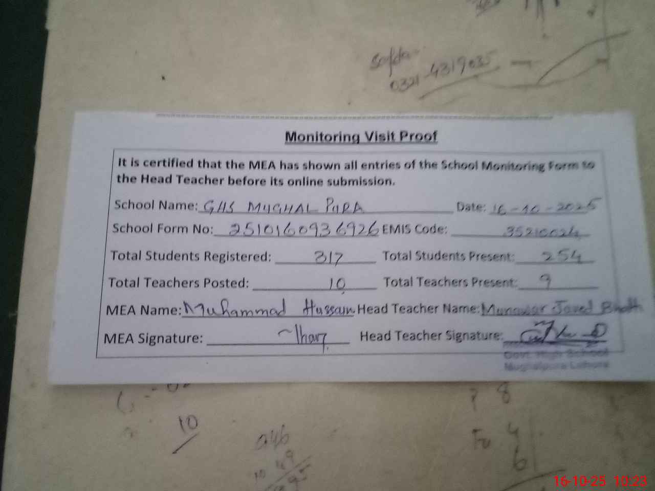 | EMIS Code: 35210024 | Name of School: GHS MUGHAL PURA LAHORE | |||