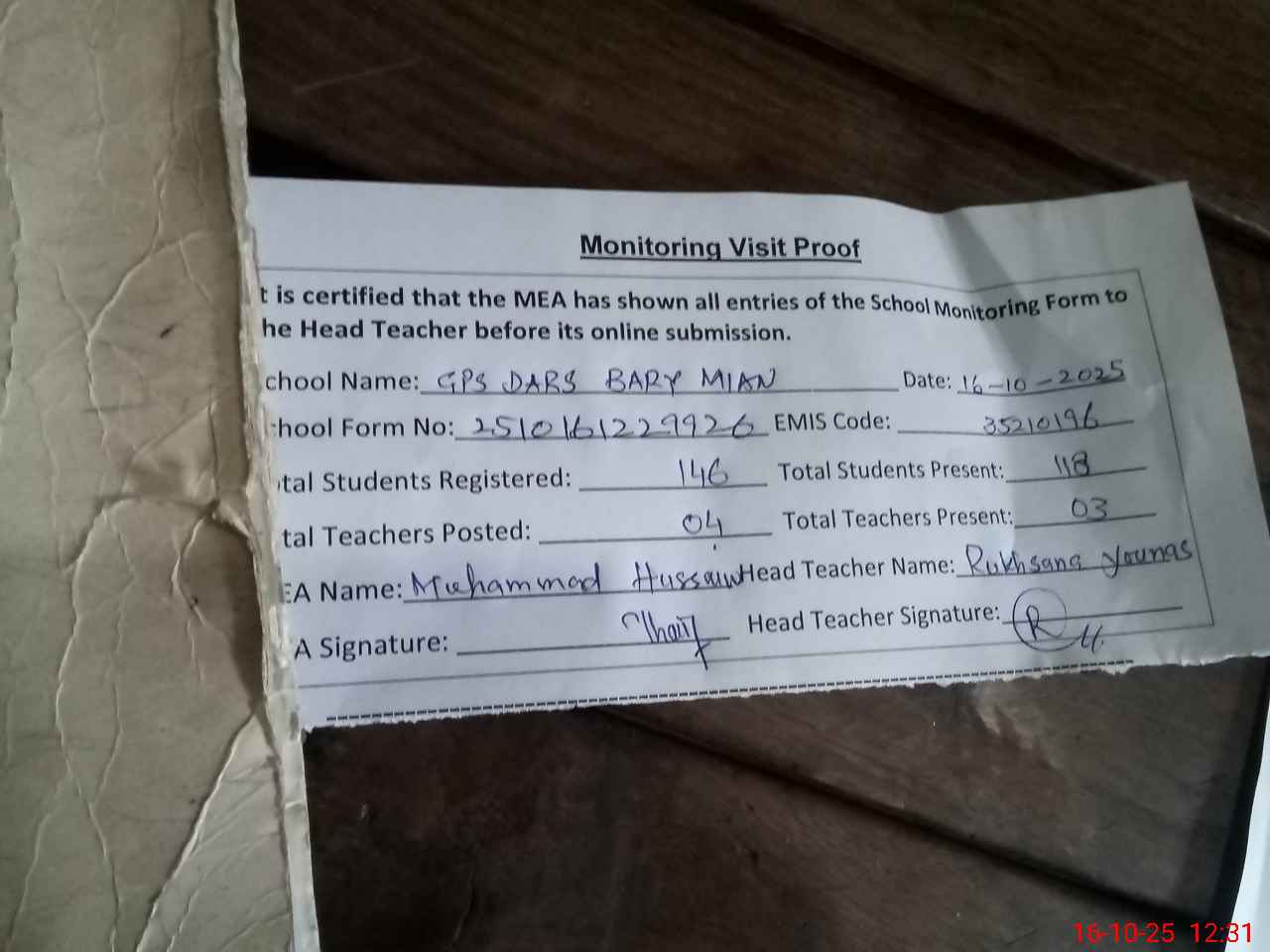 | EMIS Code: 35210196 | Name of School: GPS DARAS BARY MIAN | |||
