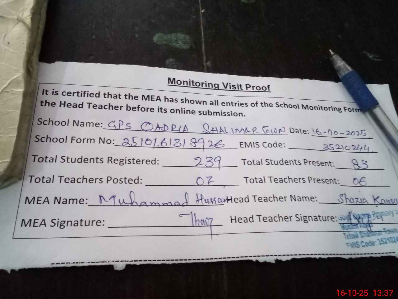 | Attendance Register | Head Teacher | MEA with School | Visit Proof |