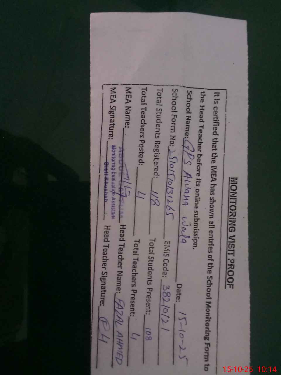 | Attendance Register | Head Teacher | MEA with School | Visit Proof |