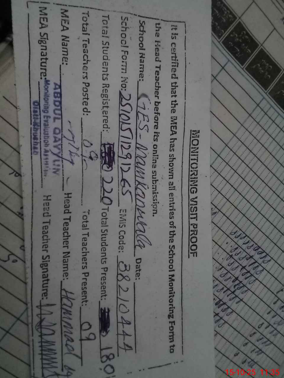 | Attendance Register | Head Teacher | MEA with School | Visit Proof |