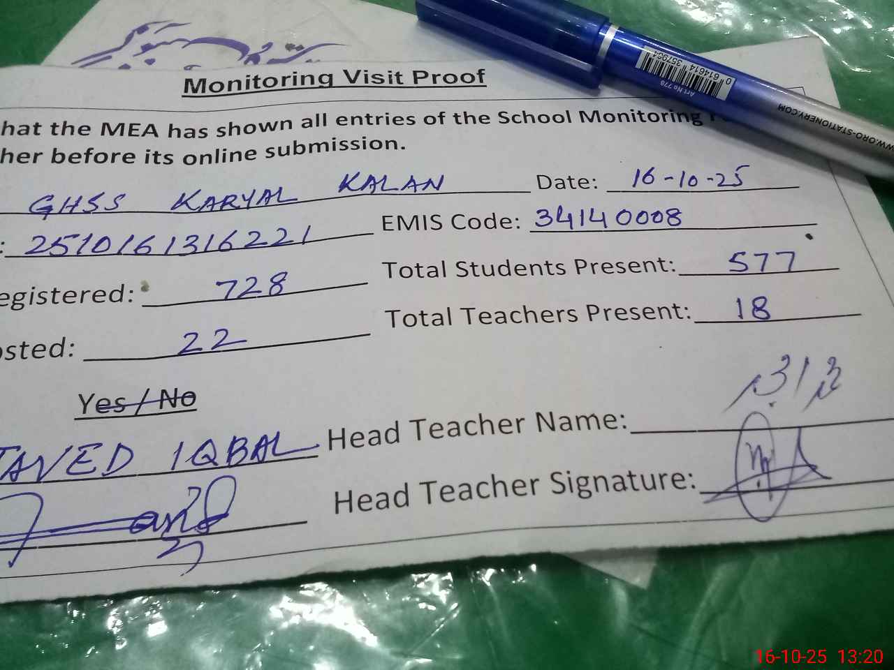| Attendance Register | Head Teacher | MEA with School | Visit Proof |