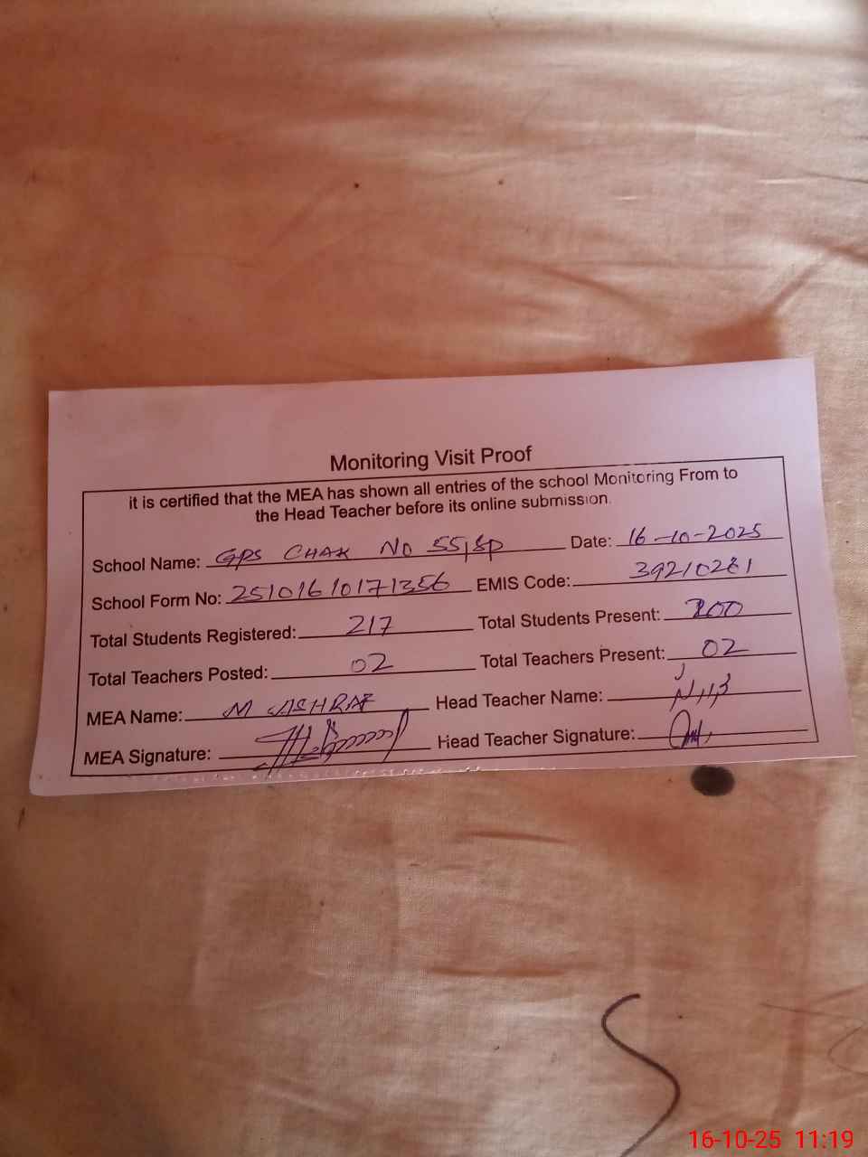 | Certified that this School was Inspected by the Undersigned MEA/DMO Today and the Information Stated Above is as Per Record. | |||||