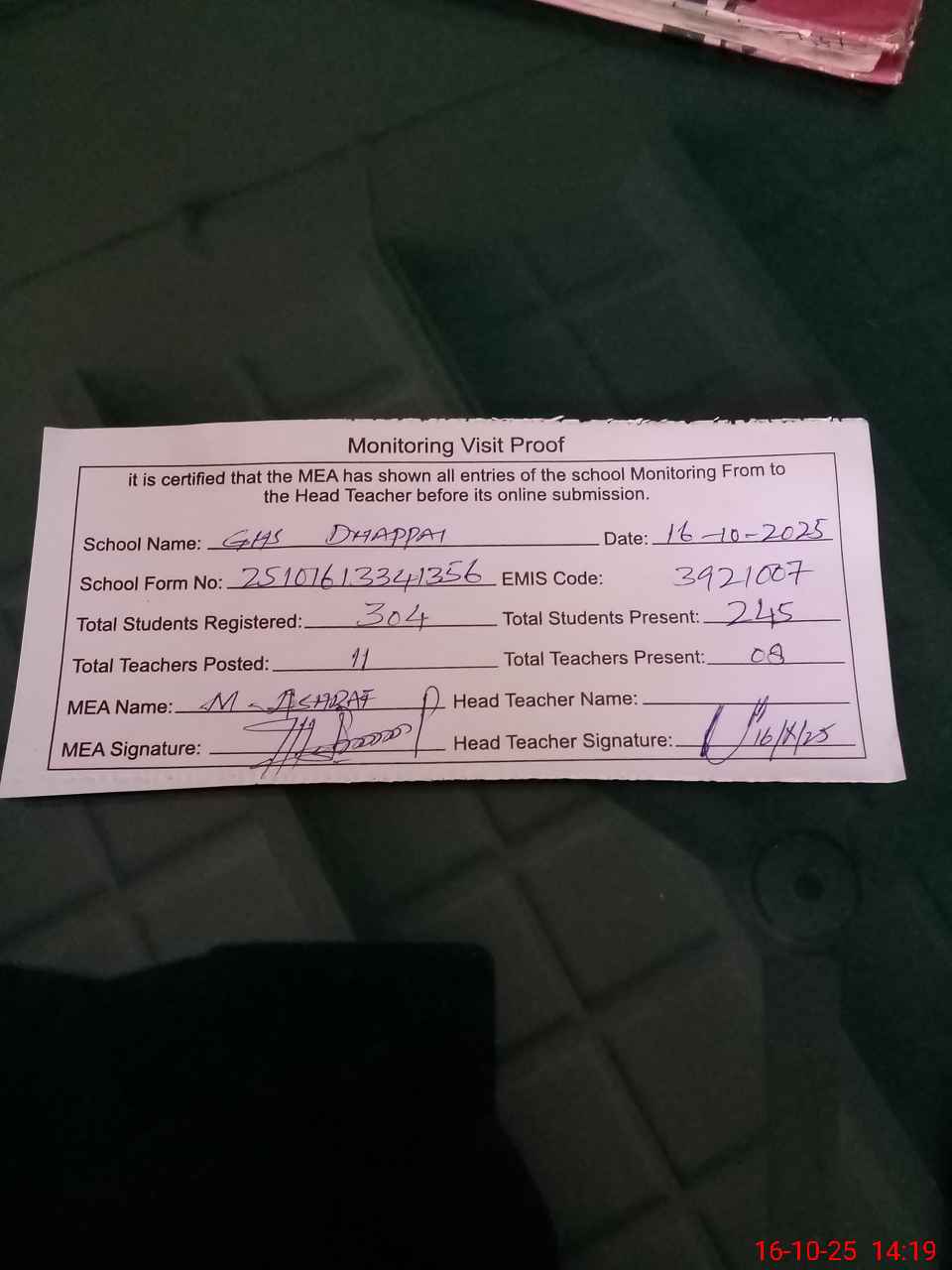 | EMIS Code: 39210007 | Name of School: GHS DHAPPAI | |||