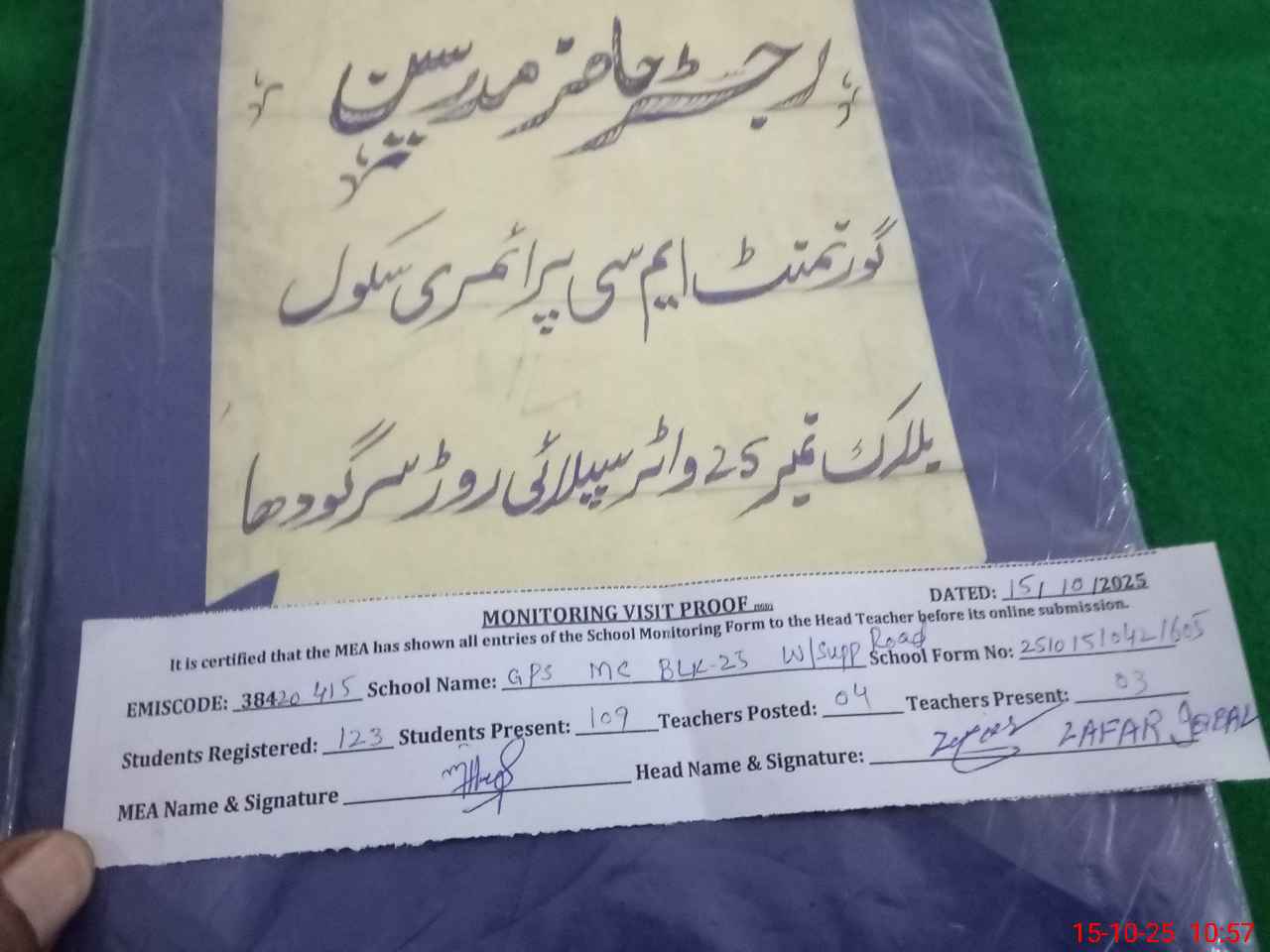 | EMIS Code: 38420415 | Name of School: GPS MC BLOCK NO.25 WATER SUPPLY ROAD SARGODHA | |||