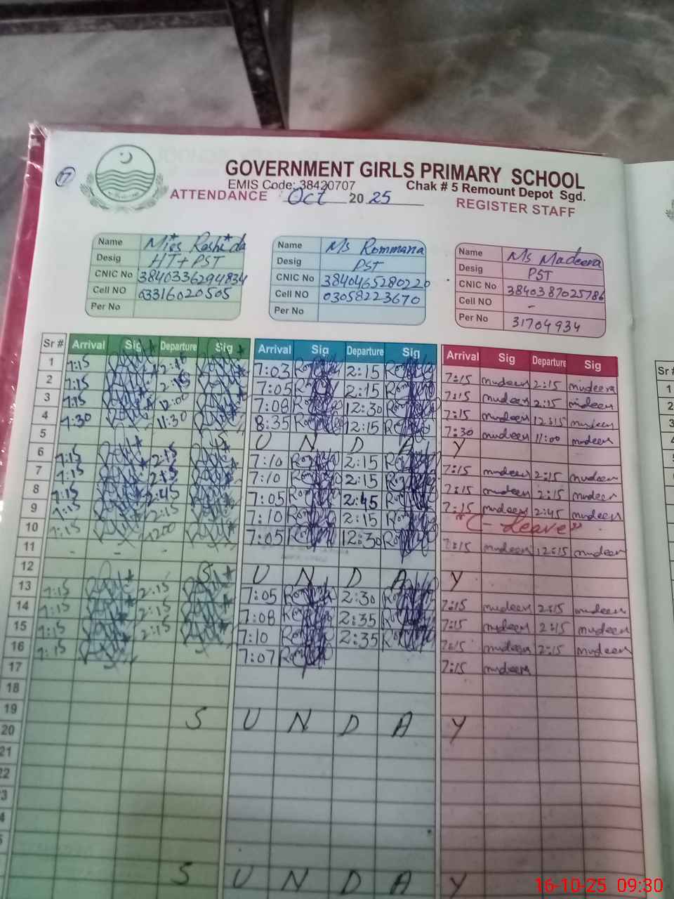 | CNIC | Full Name | Designation | R/C | Absence during last cal. month |
