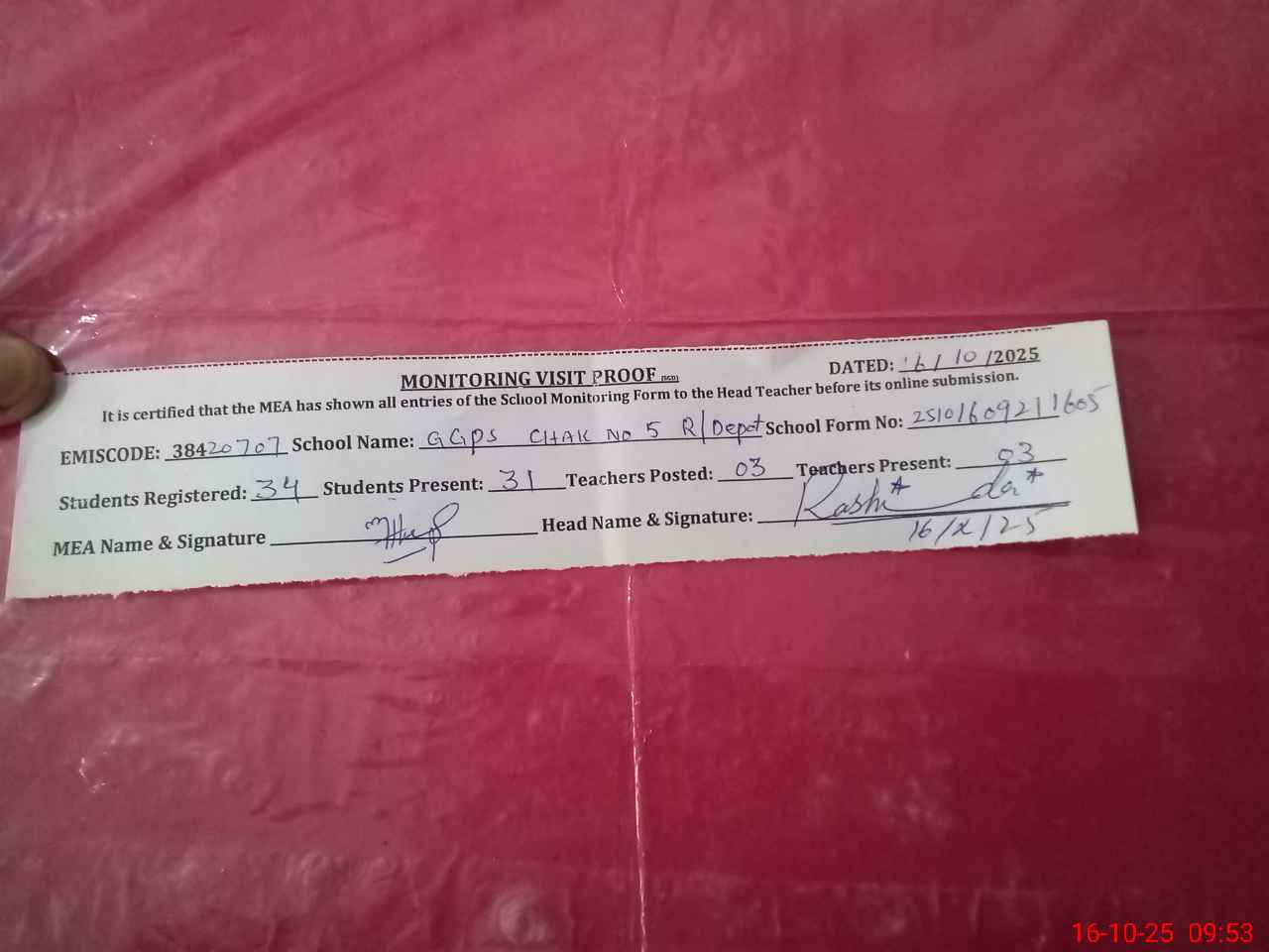 | Attendance Register | Head Teacher | MEA with School | Visit Proof |