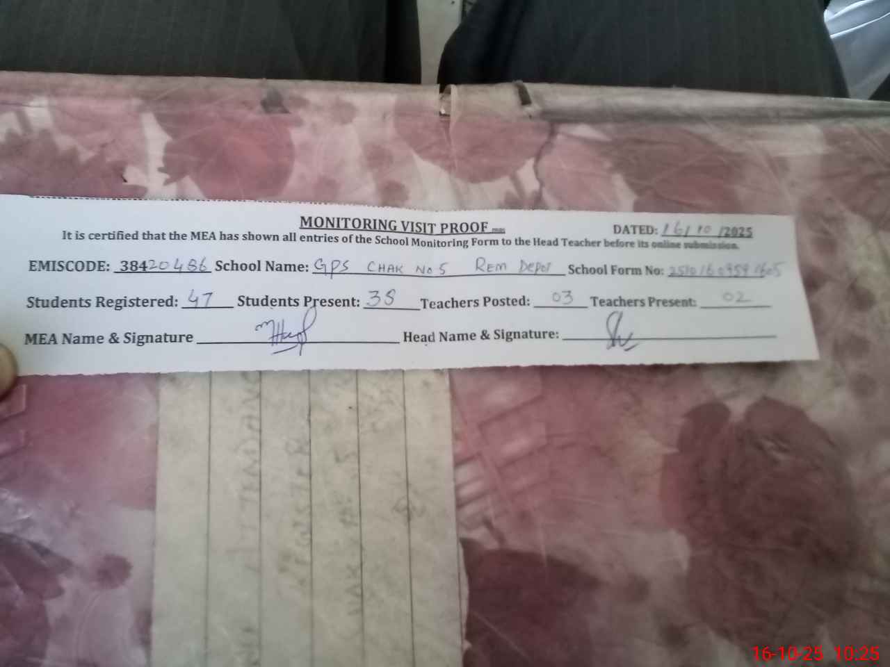 | Certified that this School was Inspected by the Undersigned MEA/DMO Today and the Information Stated Above is as Per Record. | |||||