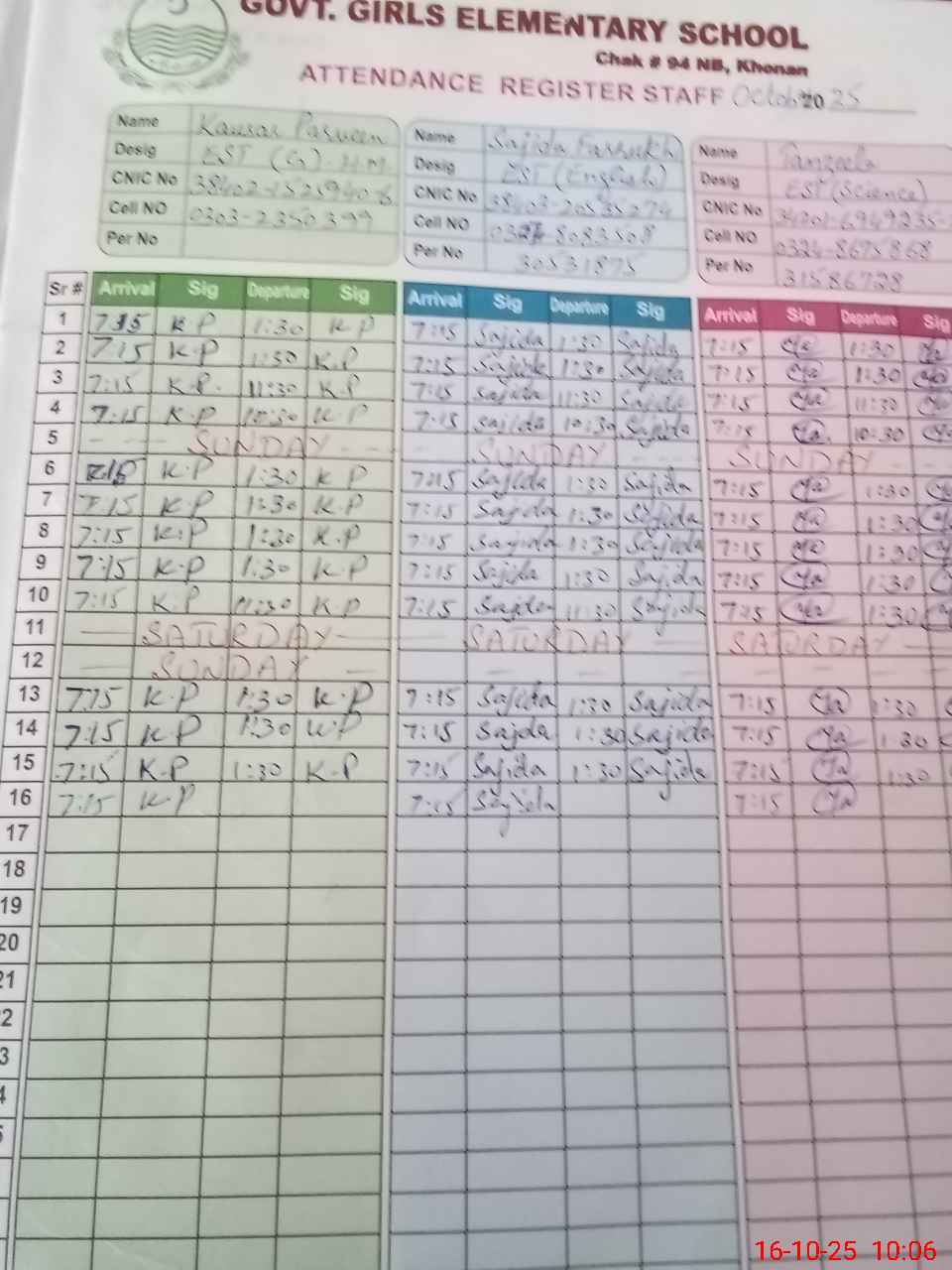 | CNIC | Full Name | Designation | R/C | Absence During Last Calender Month |