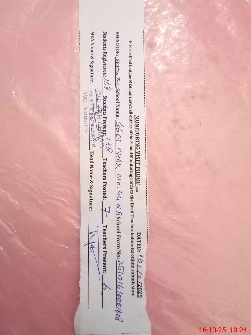 | Certified that this School was Inspected by the Undersigned MEA/DMO Today and the Information Stated Above is as Per Record. | |||||