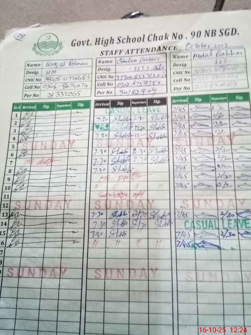 | CNIC | Full Name | Designation | R/C | Absence during last cal. month |
