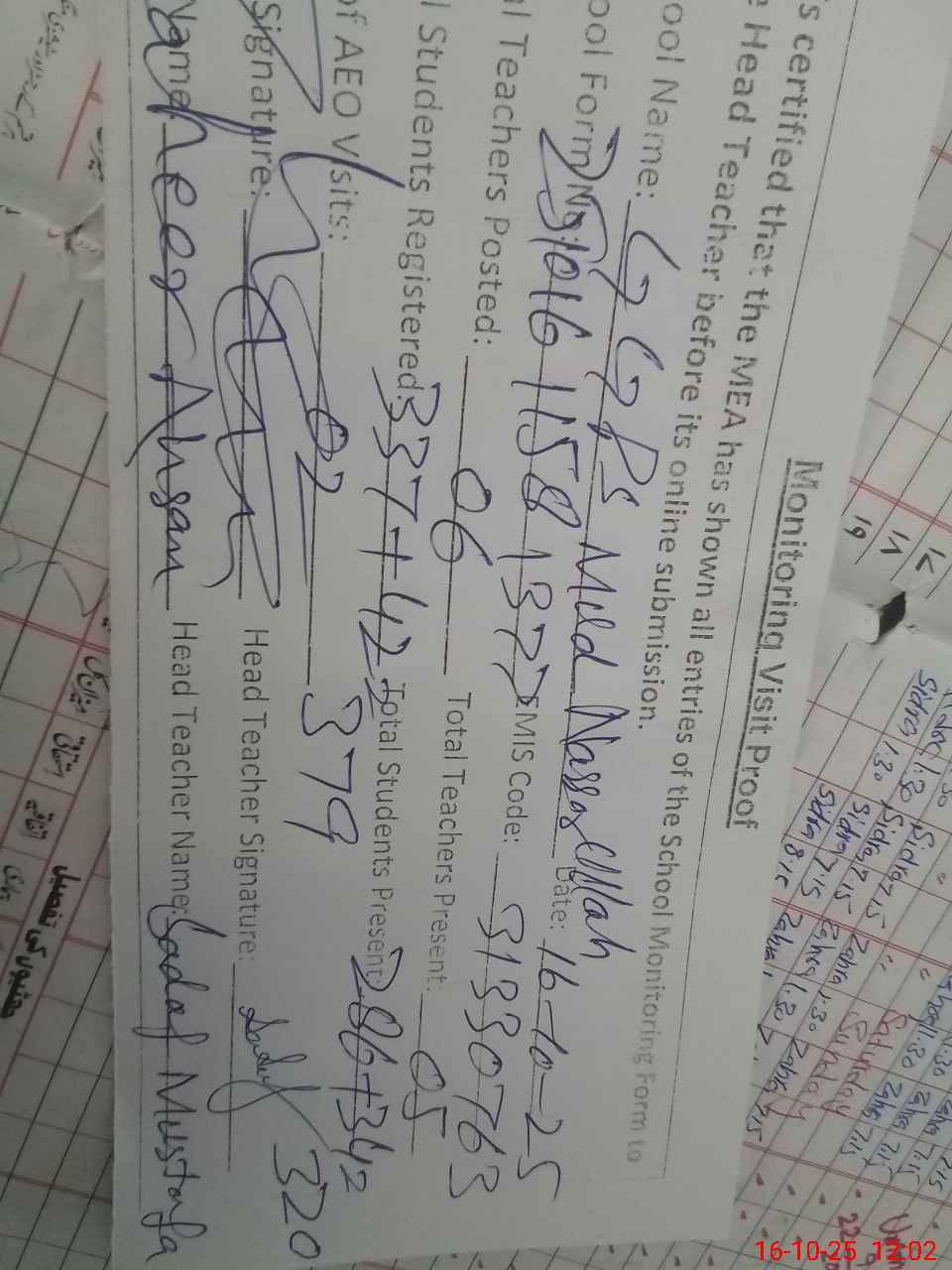 | EMIS Code: 31330763 | Name of School: GGPS MUD NUSARULLAH | |||