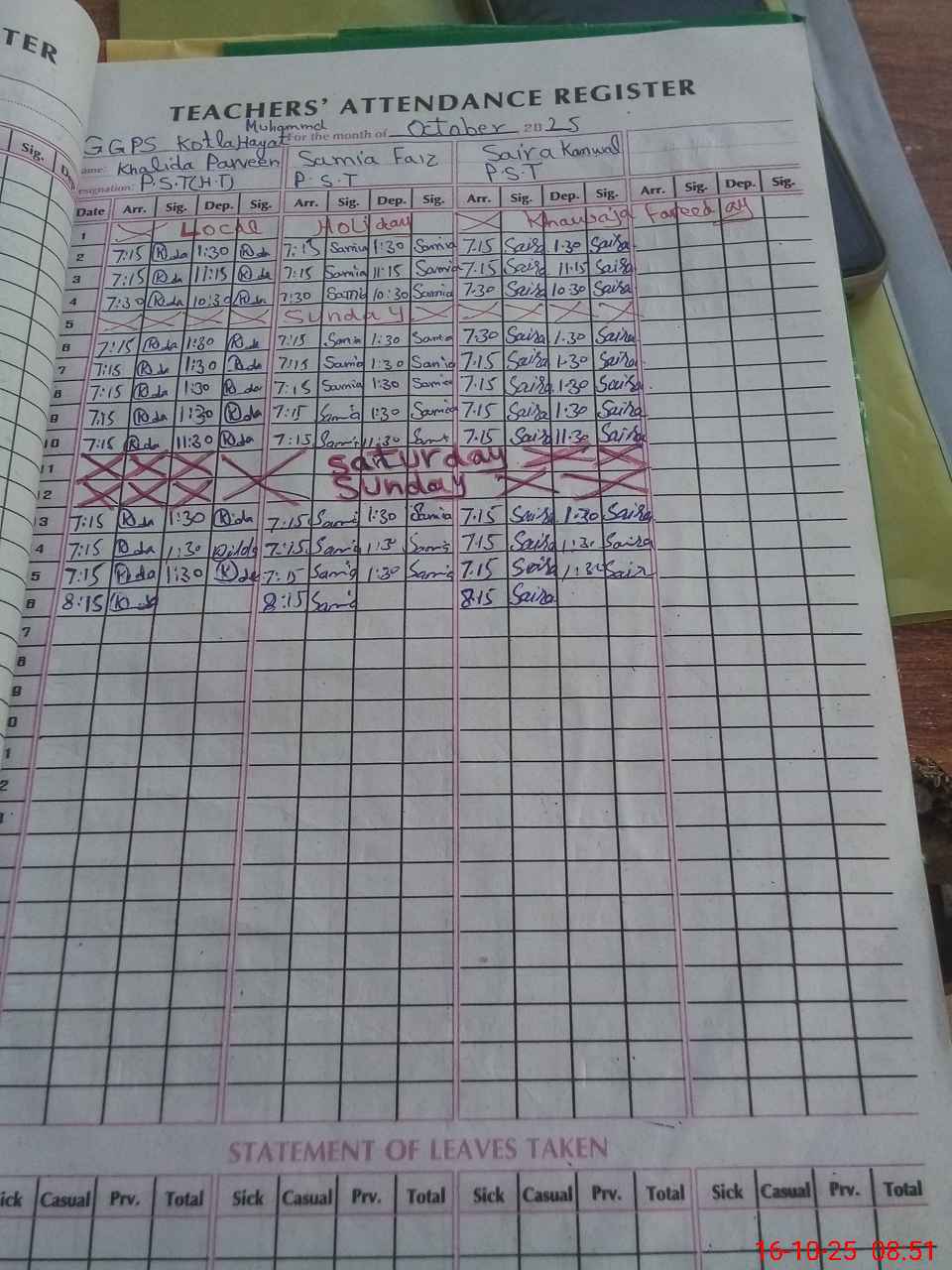 | Remarks (Use Separate Page if Required): Class redum verification is not updated on mea tab as per sis and online teacher attendance not updated on sis today and All classes are sitting on open air and two class rooms are in dangerous condition and solar and wapda electric is not availab electric connection is taken from private home and peon is absent from 6 Oct 2025 to today up till now | |||||