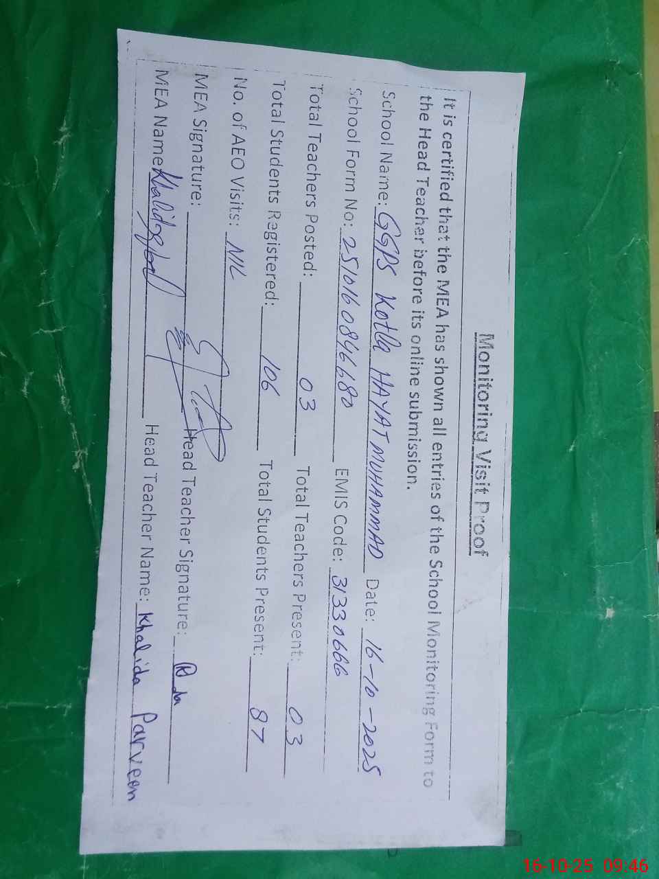 | EMIS Code: 31330666 | Name of School: GGPS KOTLA HAYAT MUHAMMAD | |||