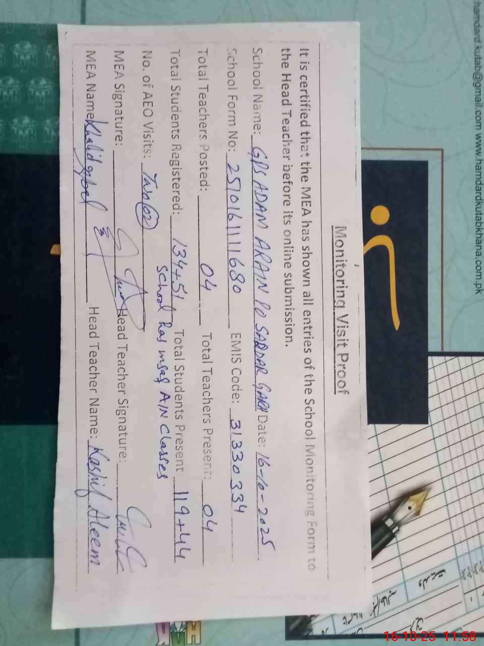| Attendance Register | Head Teacher | MEA with School | Visit Proof |