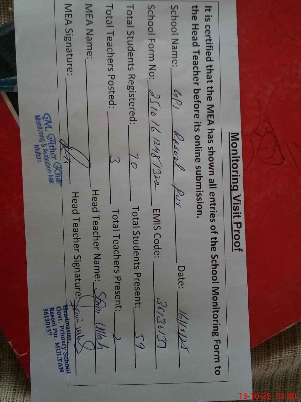 | EMIS Code: 36130137 | Name of School: GPS RASOOL PUR MOZA RASOOL PUR MULTAN | |||