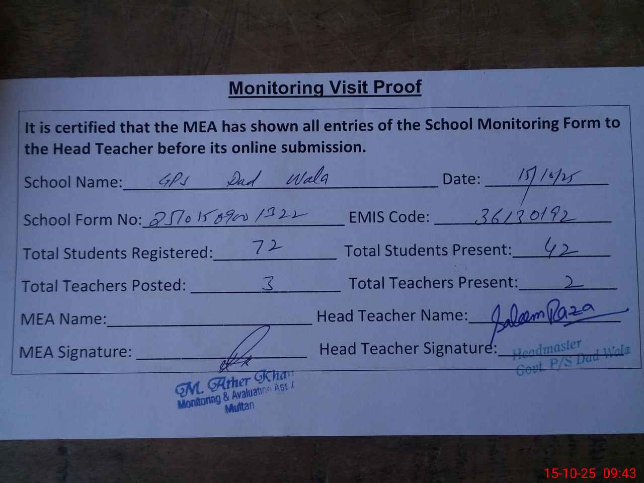 | Attendance Register | Head Teacher | MEA with School | Visit Proof |