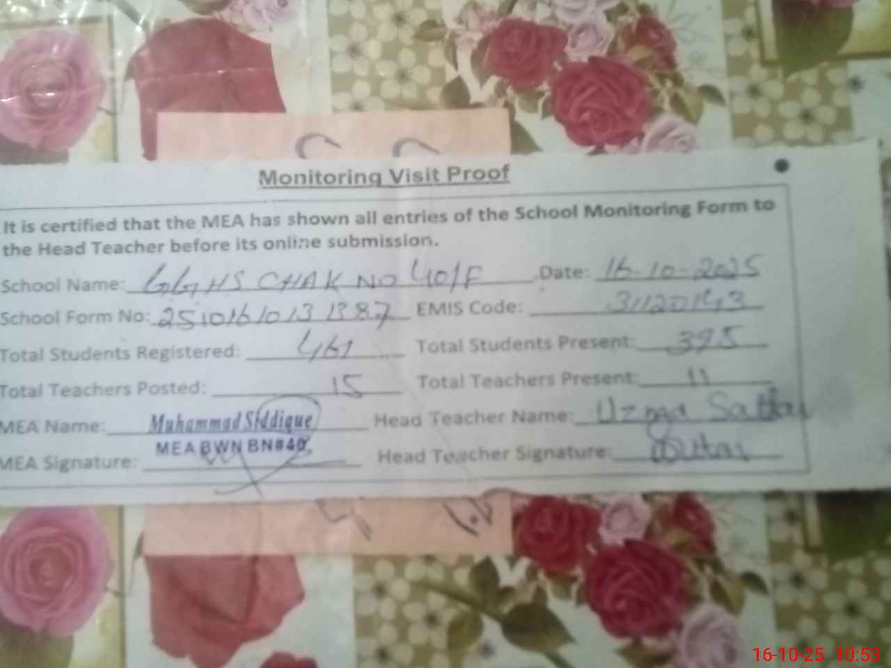 | EMIS Code: 31120143 | Name of School: GGHS CHAK NO. 40/F | |||