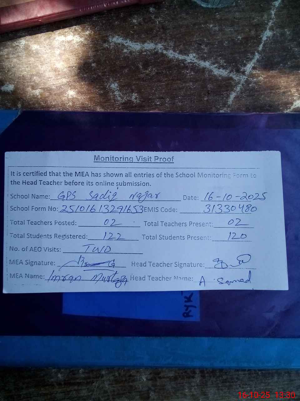 | Attendance Register | Head Teacher | MEA with School | Visit Proof |