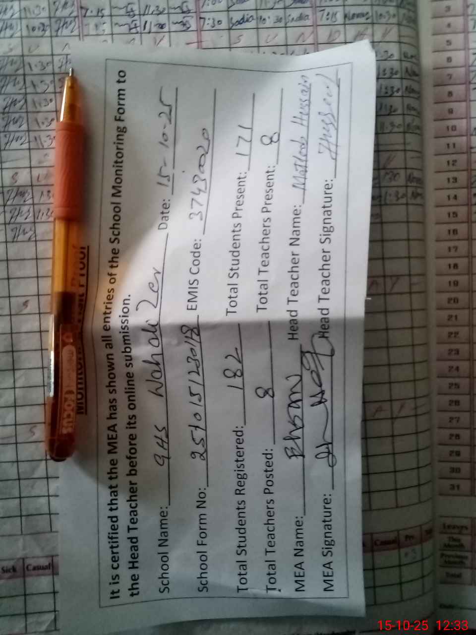| Attendance Register | Head Teacher | MEA with School | Visit Proof |
