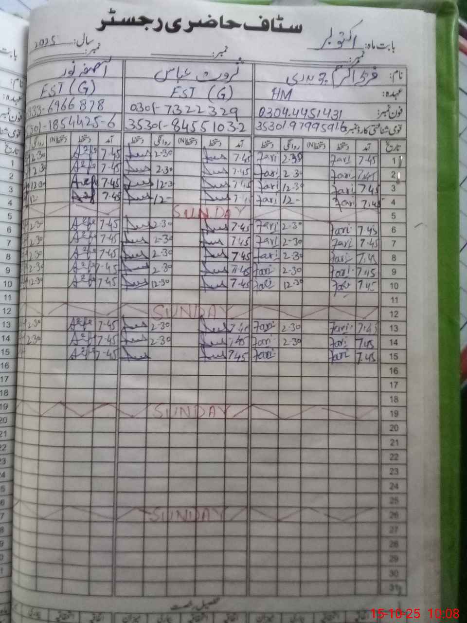 | CNIC | Full Name | Designation | R/C | Absence During Last Calender Month |