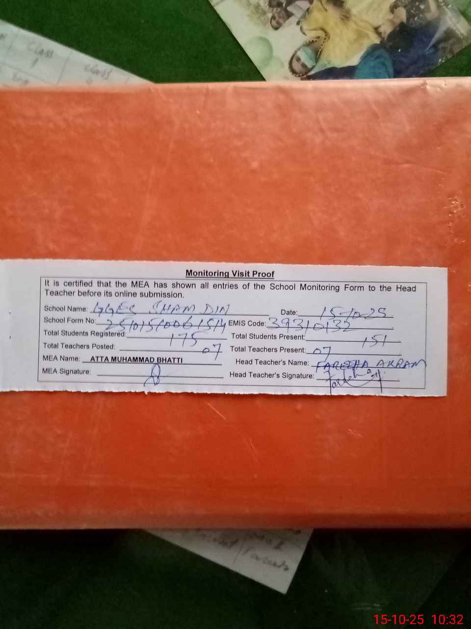 | Attendance Register | Head Teacher | MEA with School | Visit Proof |