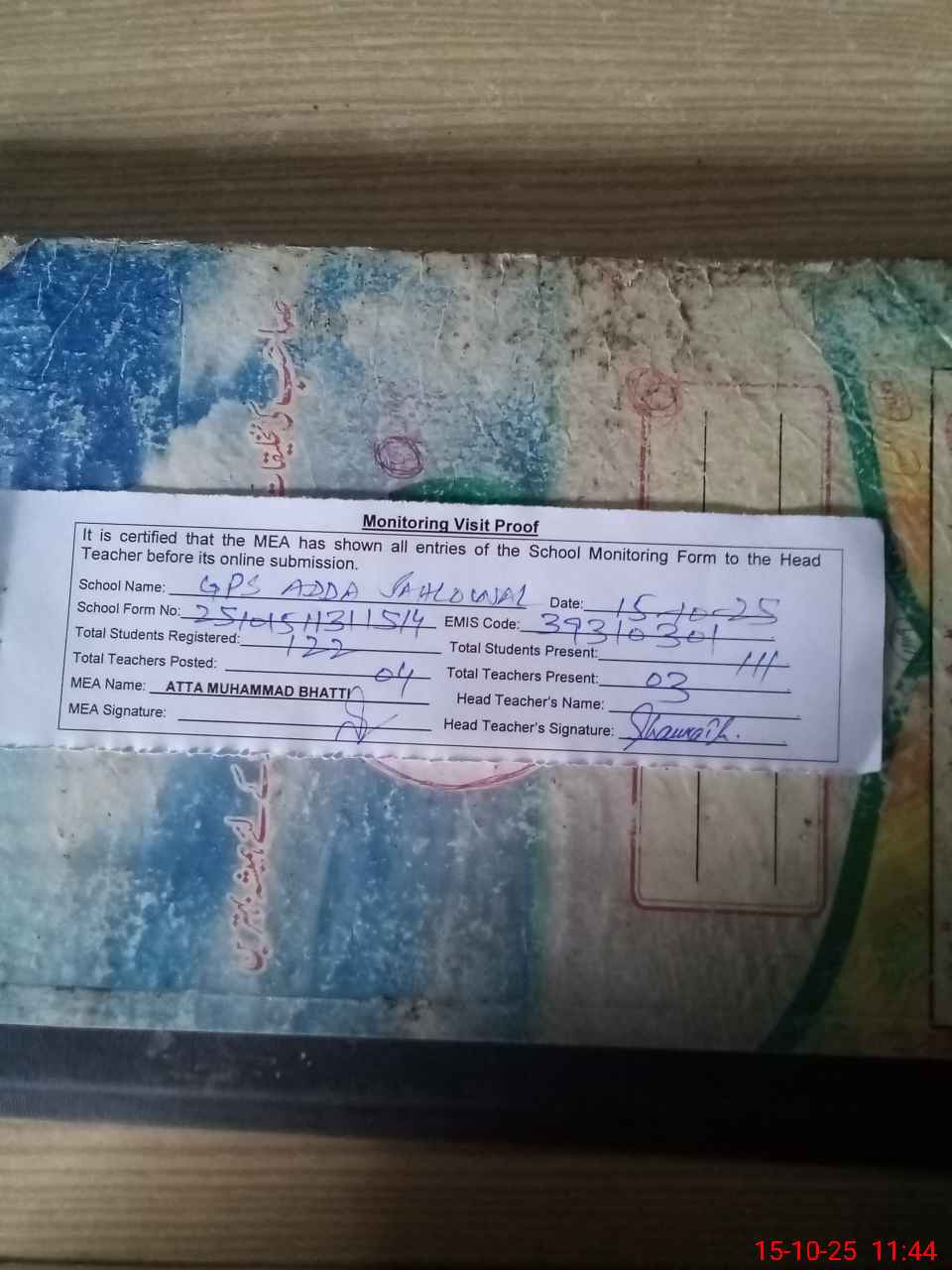 | Attendance Register | Head Teacher | MEA with School | Visit Proof |