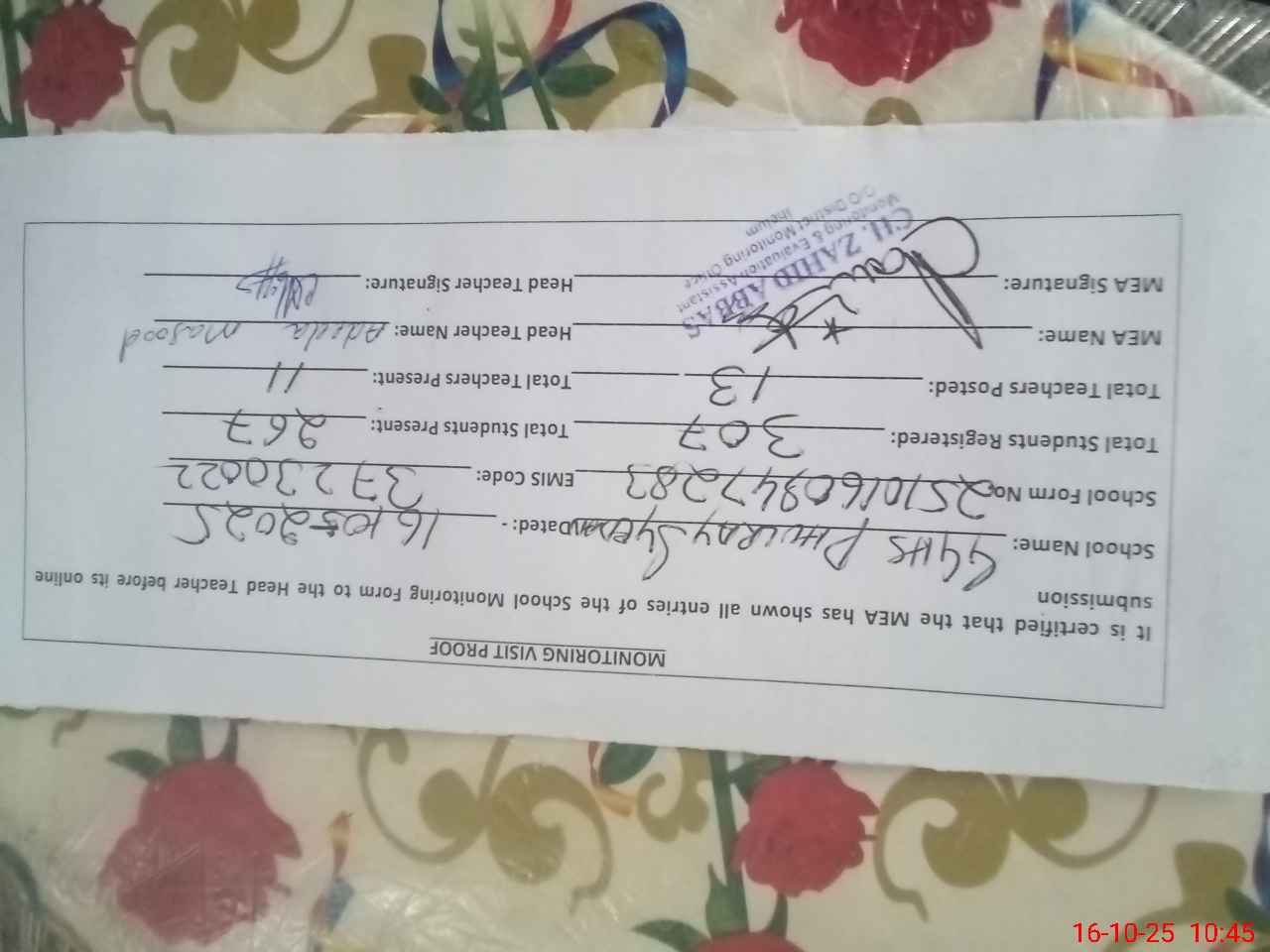 | Name: Ad**** Ma**** Designation: (School Headmaster's/Headmistress's) HM OPS Phone/Cell Number: 03**** |