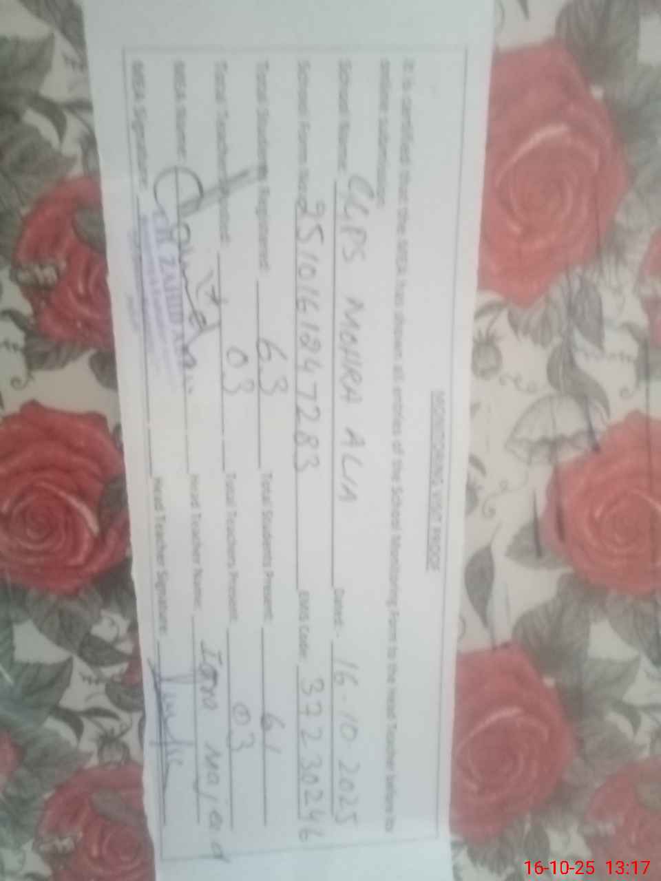 | Attendance Register | Head Teacher | MEA with School | Visit Proof |