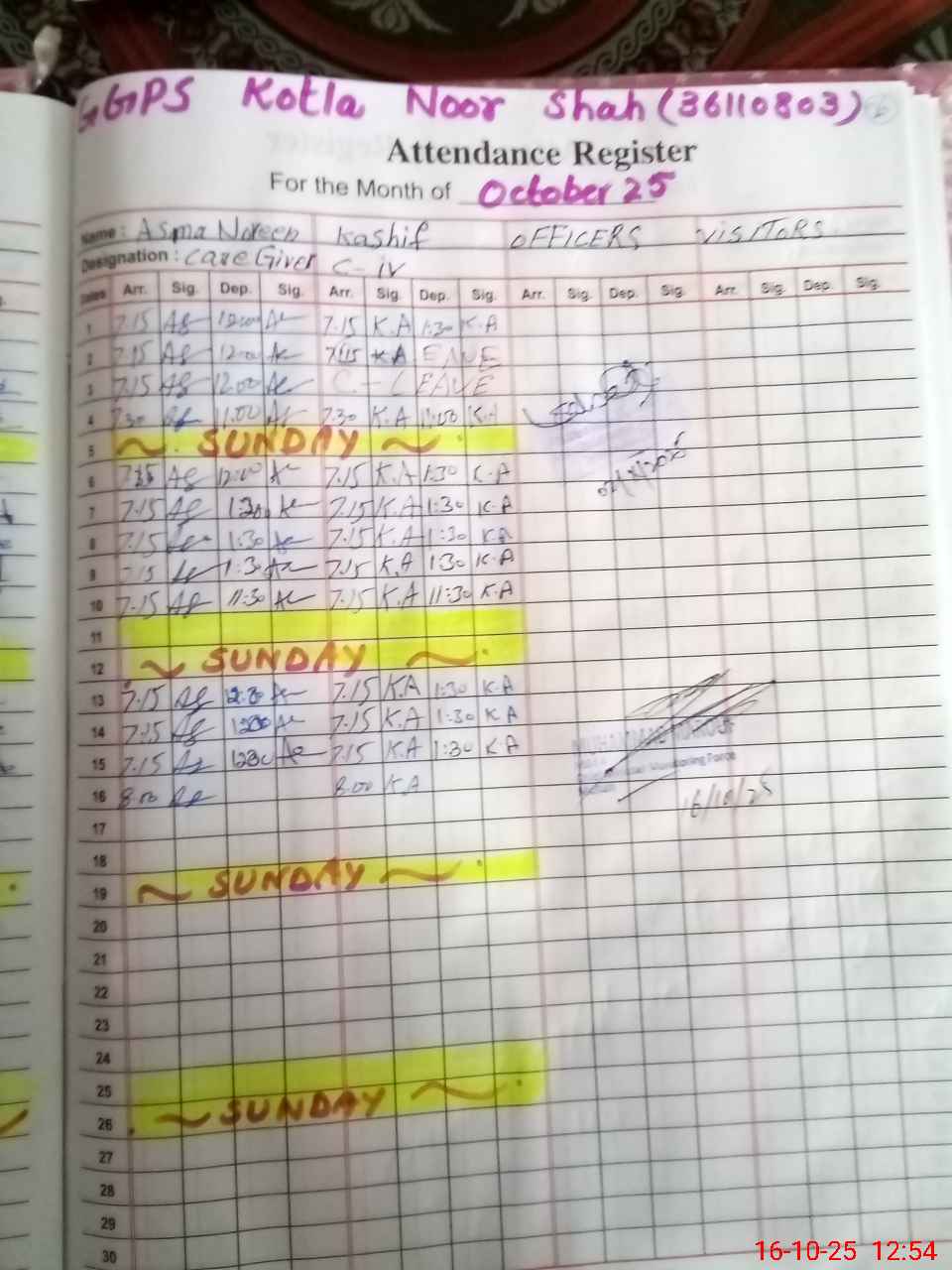 | CNIC | Full Name | Designation | R/C | Absence During Last Calender Month |