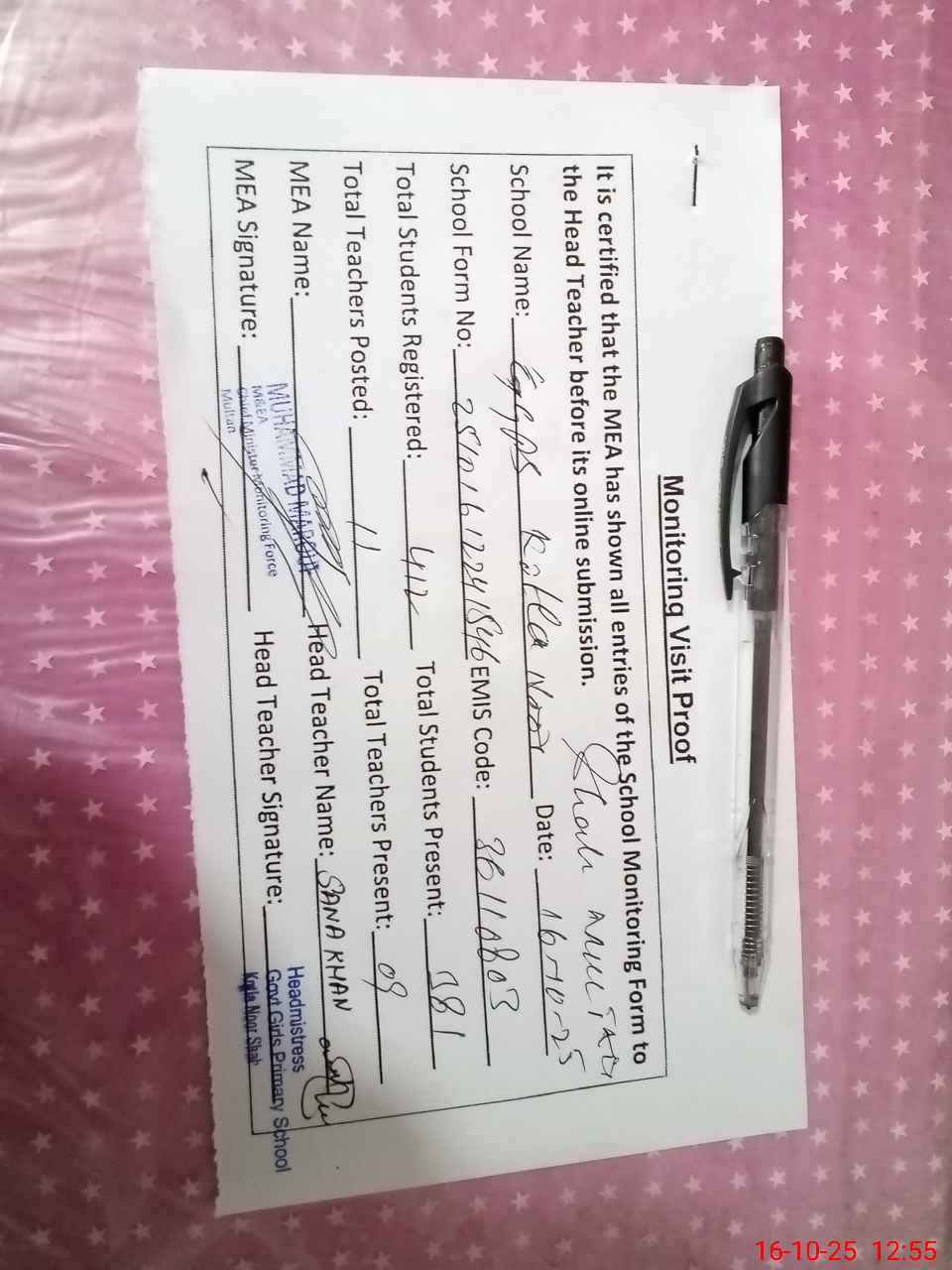 | Certified that this School was Inspected by the Undersigned MEA/DMO Today and the Information Stated Above is as Per Record. | |||||