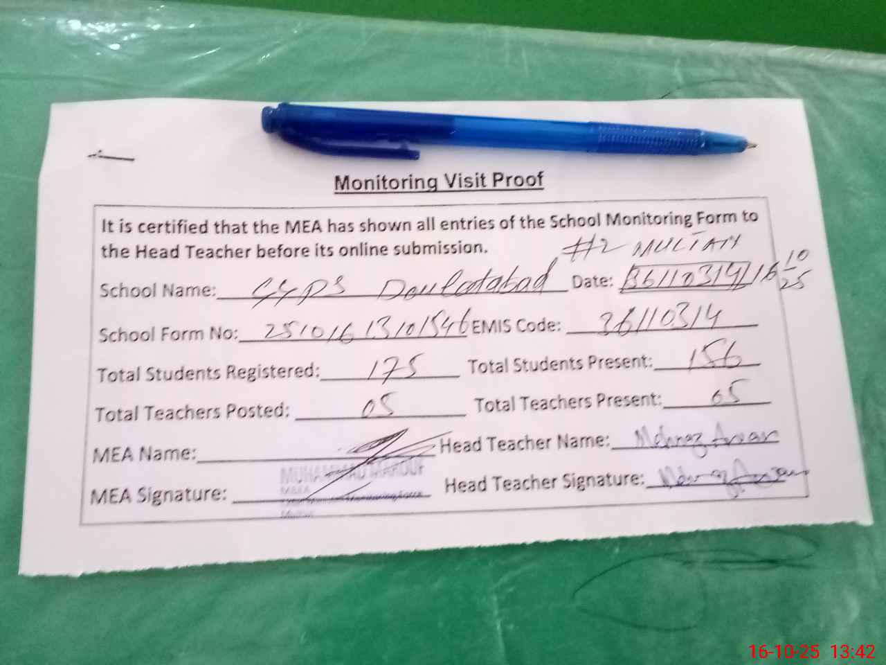 | Attendance Register | Head Teacher | MEA with School | Visit Proof |