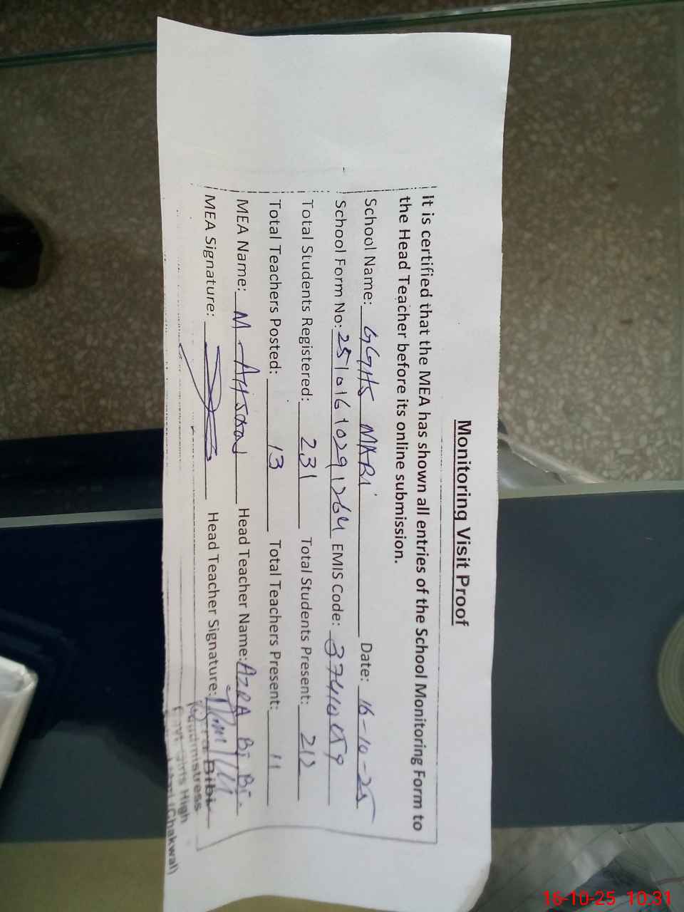 | Attendance Register | Head Teacher | MEA with School | Visit Proof |