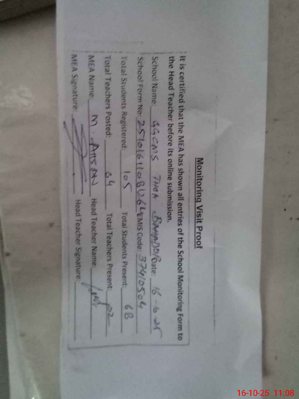 | Attendance Register | Head Teacher | MEA with School | Visit Proof |
