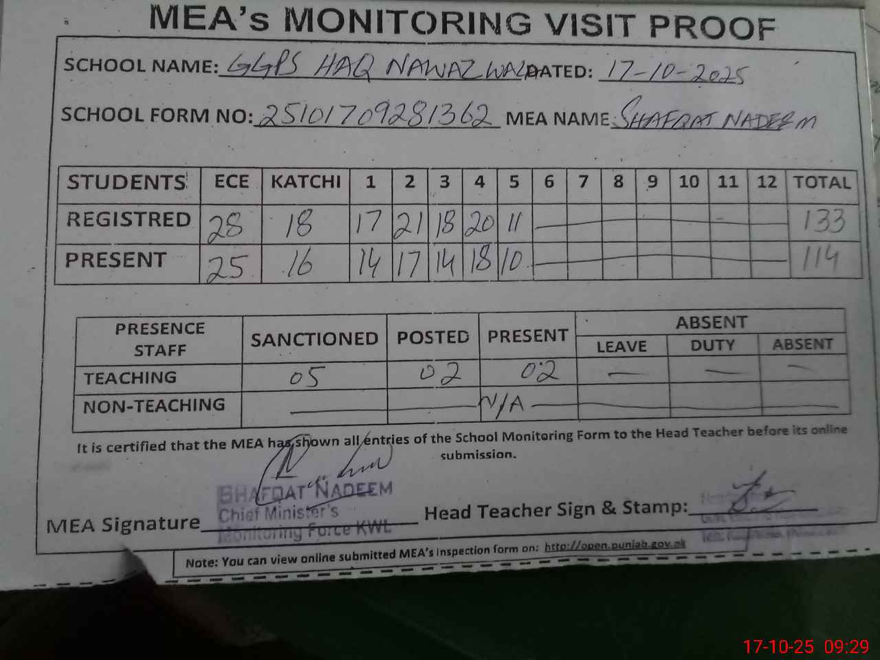| Attendance Register | Head Teacher | MEA with School | Visit Proof |