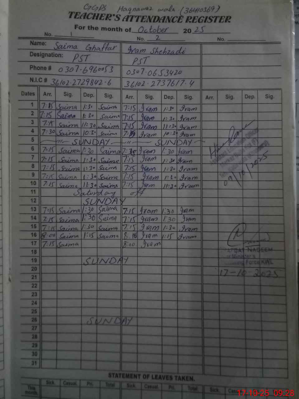 | CNIC | Full Name | Designation | R/C | Absence During Last Calender Month |